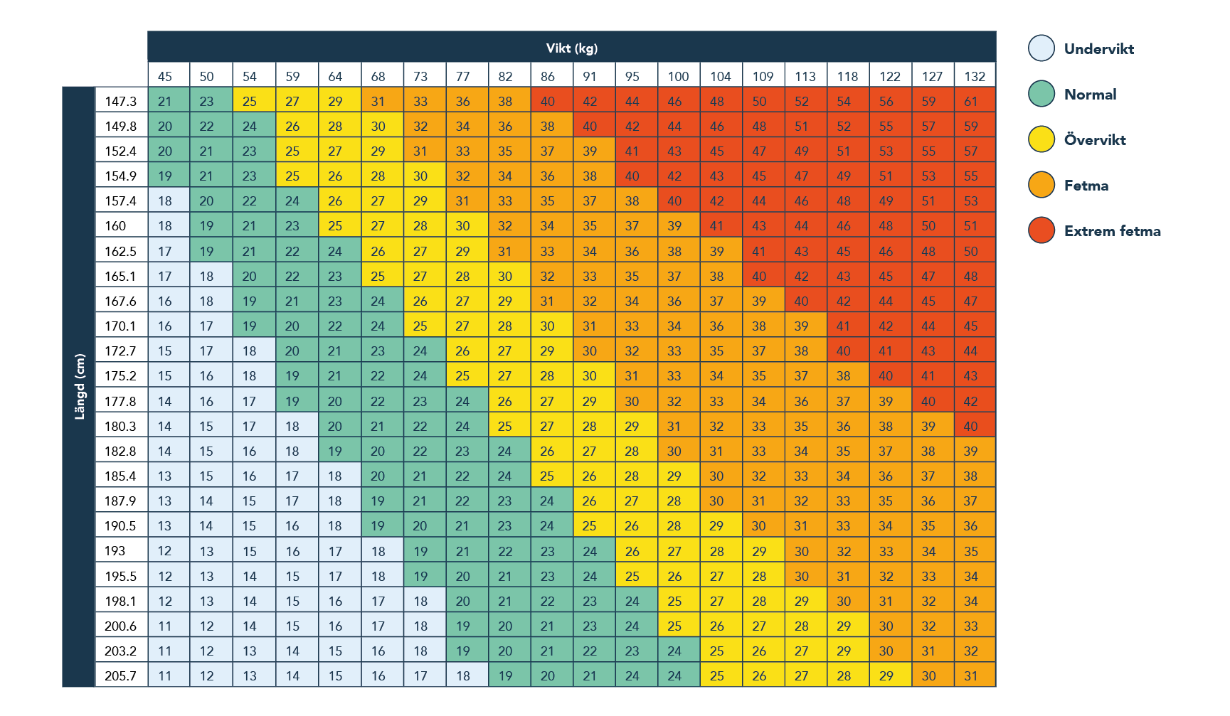 Ett vanligt sätt att få en uppfattning om kroppsvikten är att kombinera vikten med kroppslängden. Detta kallas för kroppsindex, BMI = Body Mass Index. För att räkna ut BMI tar man vikten i kg och dividerar med kvadraten på kroppslängden i meter; BMI = vikt i kg/längd i m2.